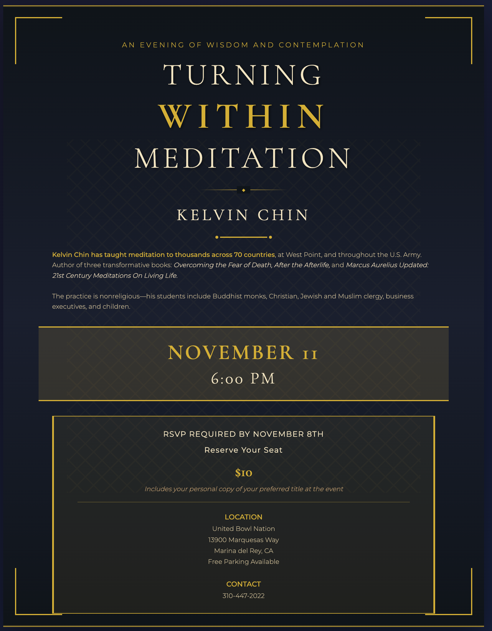 Kelvin Chin has taught meditation in the military helping soldiers, veterans, contractors, and “Gold Star Families” deal with and overcome the full range of issues that come with military service, both in war zones overseas and in the U.S.